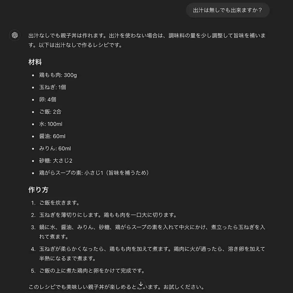 まずは基本のレシピ生成から。AIに「親子丼を作りたい」と伝えると、すぐにレシピを提示してくれます。